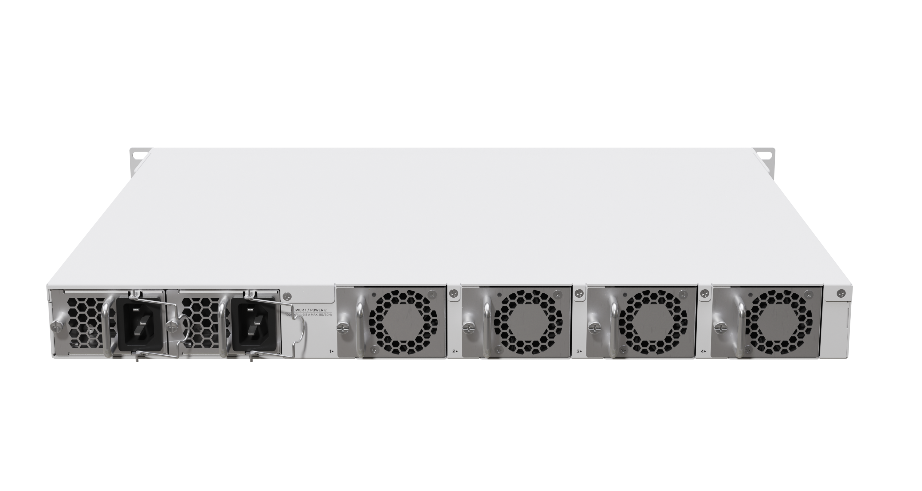 There are 2x QSFP28 cages for blazing-fast 100 Gigabit connectivity, 12x SFP28 cages for 25 Gigabit networking, and a Gigabit Ethernet port. The device comes with 16 GB of RAM, decent NAND storage, and two M.2 SATA slots for additional storage. There are four hot-swappable fans, as well as dual-redundant hot-swap power supplies. And these PSUs might look familiar if you have used our CCR1072 before: you can keep using your previous hot-swap power supplies and SFP modules.