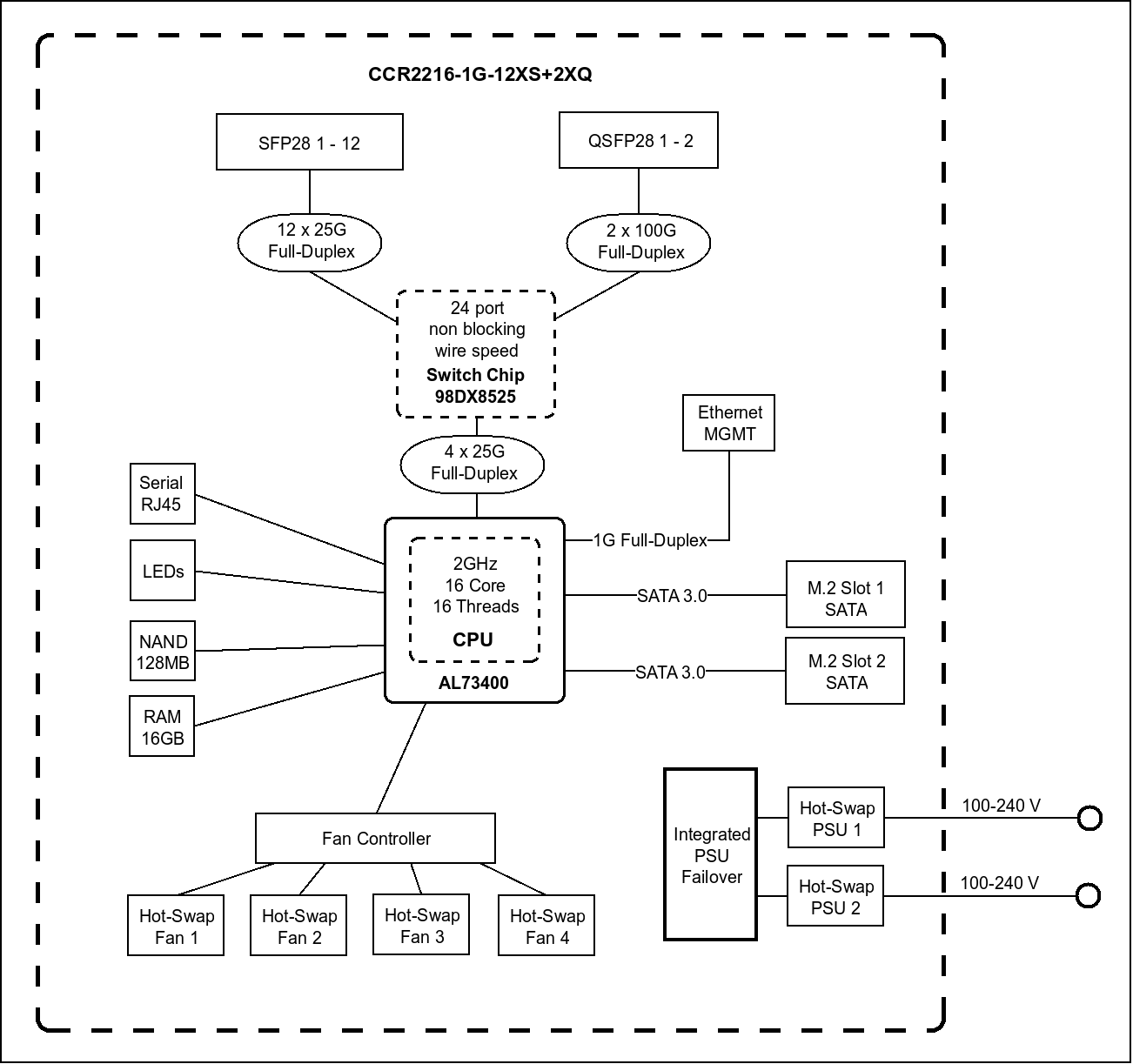 But the exceptional Marvell Prestera Aldrin2 switch-chip really takes it to the next level with L3 Hardware Offloading! Our previous CCR2116 featured a switch-chip with four 10G CPU connection lines, but this time there are four 25G lines!